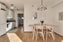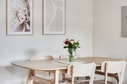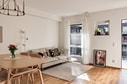 Ljust och trivsamt vardagsrum med ekparkett och ett generöst fönsterparti som sträcker sig ända ner till golvet. Fönstren i sydvästläge mot innergården ger ett fantastiskt ljusinsläpp och skapar en charmig atmosfär. Här finns gott om plats för både soffa och matplats i öppen anslutning till köket.