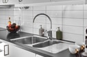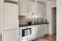 Stilrent och funktionellt kök med mörk bänkskiva som kontrasterar snyggt mot övriga material. Köket är utrustat med kyl/frys, ugn, häll och diskmaskin.