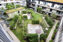 Gemensam trädgård med två fina trädäck med bord och bänkar.