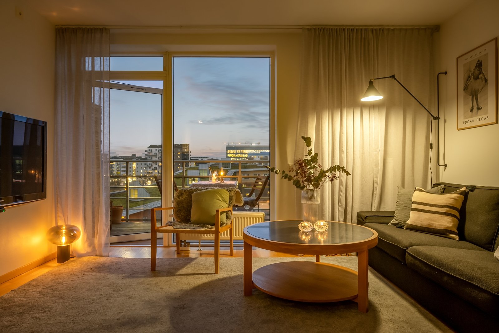 Attraktiv bostad högt upp i huset med fri utsikt och balkong, centralt i Västra Hamnen.