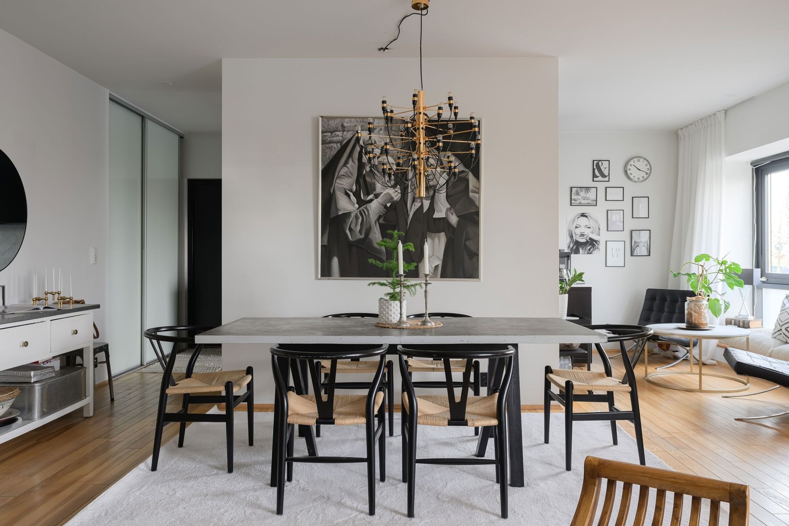 Askparkett på golvet och vita väggar Här erbjuds generösa ytor med plats för både soffgrupp, större matplats och en portabel walk in closet.