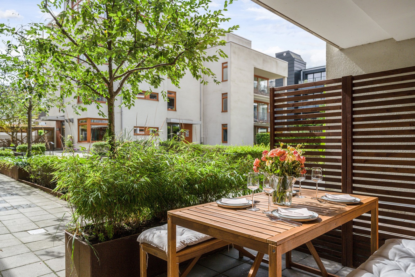 I lägenheten erbjuds vardagsrum i vinkel med matplats och utgång till en härlig södervänd uteplats där man blickar över föreningens välskötta innergård.