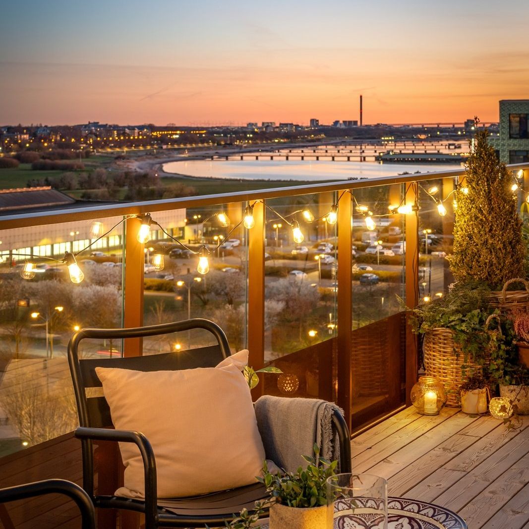 TAKTERRASS 2: Via två olika glasdörrar kan gästerna mingla ut med sina fördrinkar. Här ligger ytterligare en takterrass med utsikt över Västra hamnens norra delar. Turning Torso tronar en bit bort. Insynsskydden i ljust ribbträ skapar rumslighet och skyddad atmosfär.