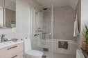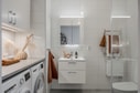 Till vänster i den inre hallen ligger ett stilsäkert badrum med ljusgrå klinker och vitt helkakel. Här finns en vägghängd handfatskommod, handdukstork, wc och duschalkov bakom glas. Badrummet rymmer även våningens tvättavdelning med överskåp, tvättmaskin, torktumlare samt arbetsyta med belysning.