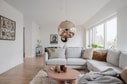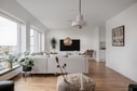 SÄLLSKAPSYTOR: Till höger i hallen fortsätter ekparketten ut i våningens tidlöst vackra sällskapsytor. Det skyhöga läget över västra hamnen blir uppenbart och den starka känslan av stora och ljusa rumsvolymer är omedelbar. Ljuset faller in i kaskader via långväggens närmast heltäckande glaspartier med låga fönsterbänkar i ljus natursten. Den spektakulära utsikten ut över Ribersborgsstranden öppnar sig till höger. Tankarna går direkt till en klassisk penthousevåning med internationell touch.