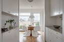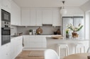 I halvöppen planlösning ligger det stora och sobra köket. En serveringsgång – med takhög förvaring och avställningsytor – leder in i de mycket ljusa ytorna. Trestavsparketten följer med in och även härinne har långväggen närmast heltäckande glaspartier med låga fönsterbänkar i ljus natursten. Den närmast minimalistiska inredningen kommer från klassiska Marbodal med slätvita fronter och sparsmakade beslag i mässing. Här finns plats för matbord och arbetsköket delas av med en fristående köksö som har högt barhäng för väntande gäster. Arbetsytorna och stänkskydden är i ljusgrå kvartskomposit med underlimmad diskho. Vitvarorna från Bosch är integrerade och går i rostfritt.