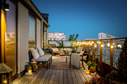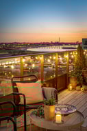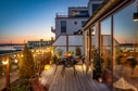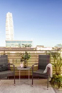 Via två olika glasdörrar kan gästerna mingla ut med sina fördrinkar. Här ligger ytterligare en takterrass med utsikt över Västra hamnens norra delar. Turning Torso tronar en bit bort. Insynsskydden i ljust ribbträ skapar rumslighet och skyddad atmosfär.
