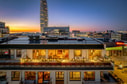Högt över Stora Varvsgatan breder de tre takterrasserna ut sig, med utsikt i fyra väderstreck. Den största ligger i soligt söderläge och de närmast heltäckande glaspartierna knyter ihop sällskapsytorna med det ännu solvarma trädäcket. Det höga panoramat är 180 grader och nere till höger faller kvällssolen in över sundet och Ribersborgsstranden. Mot den apelsinfärgade himlen avtecknar sig brofästet längst bort, och rödblanka vågor slår mot stranden, bara några hundra meter bort.