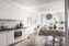 Kök - Vi kommer vidare in i köket med stilrena val i form av vita skåpsluckor, svart bänkskiva och ljust stänkskydd. Här finns plats för ett litet matbord och köket är utrustat med spishäll, ugn, kyl/frys samt kolfilterfläkt.