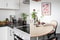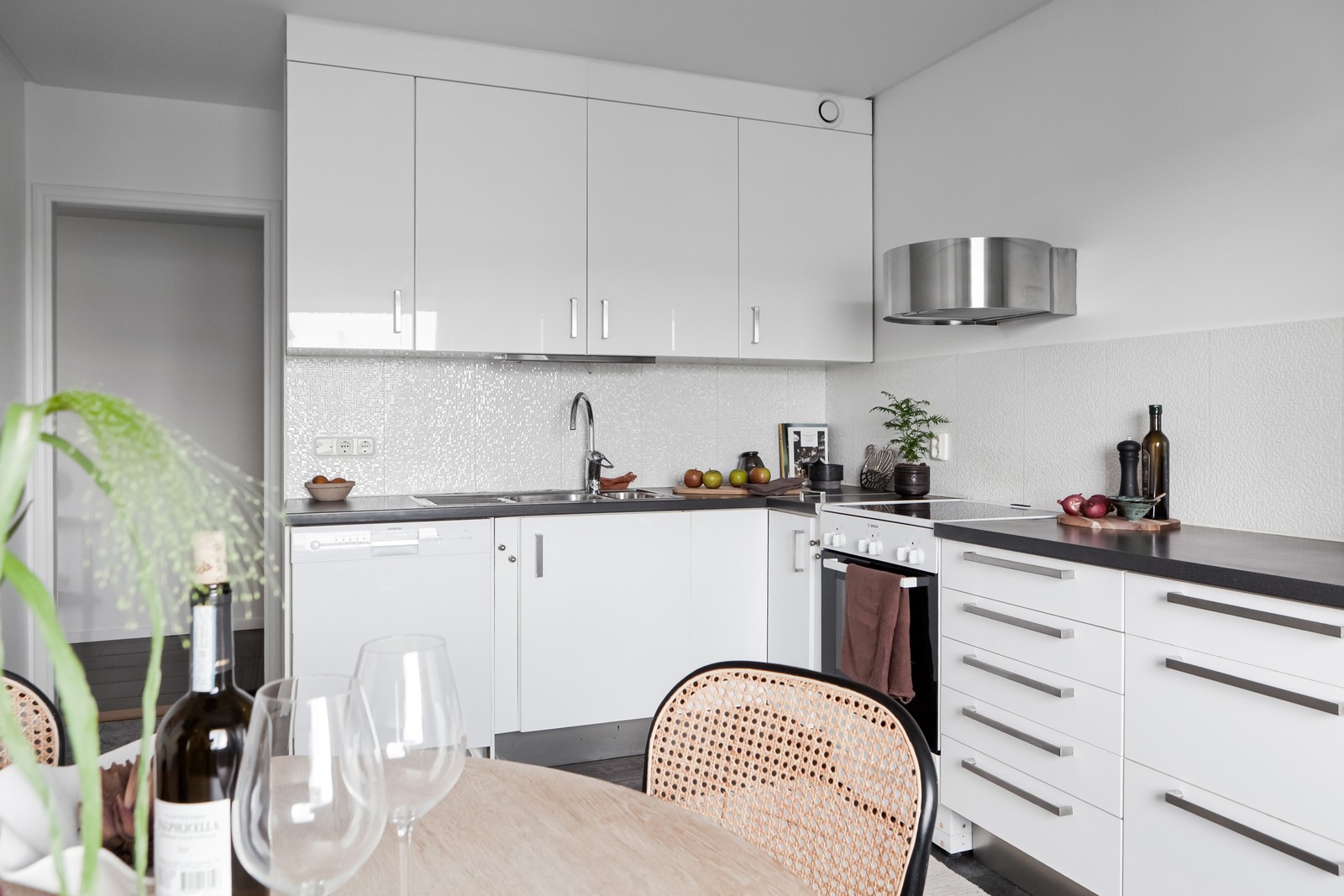 Rymligt kök i ljusa färger med plats för 4–6 personer vid matbordet. Köket, från IKEA, erbjuder gott om både förvaring och arbetsyta. Laminatgolv och ljusa väggar skapar en fräsch känsla. Utrustat med spis, ugn, kyl/frys, fläkt och diskmaskin. Laminatbänkskiva med kakel som stänkskydd ger ett stilrent intryck.