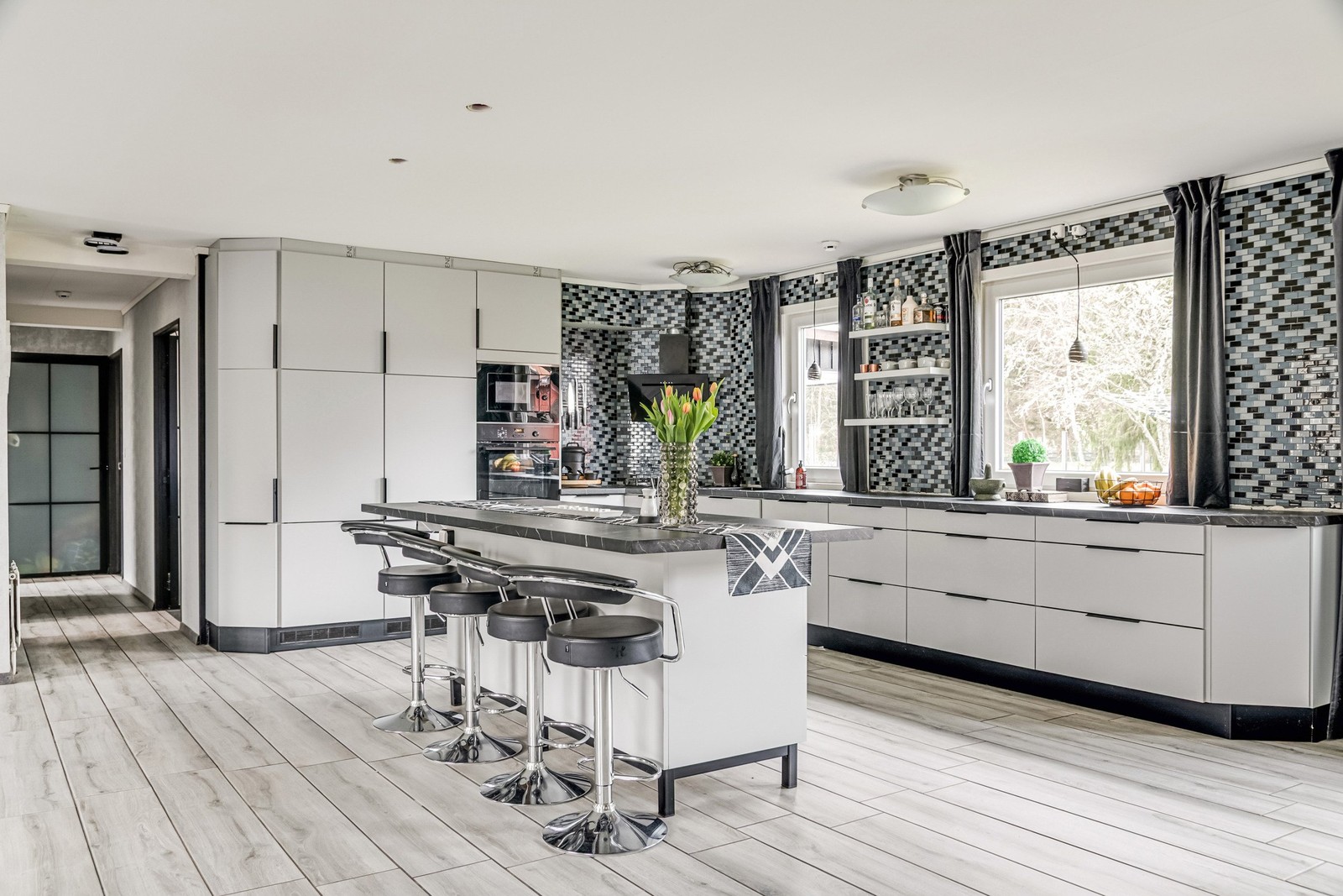 Köket är hemmets självklara samlingspunkt, ett riktigt drömkök för den som älskar matlagning och socialt umgänge. Här finns generösa arbetsytor, en stor köksö med plats för flera sittande gäster och gott om förvaring i eleganta skåp med släta fronter. Intill köket finns en ljus matplats med plats för det stora sällskapet.