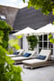 Vidare förbi matplatsen kommer ni vidare till en privat sovrumsavdelning med badrum och två rum i anslutning, förenade av vackra pardörrar. Här går färgskalan i mustigt svart på snickerier och väggar som utgör en stilfull effekt till det ljusa brädgolvet. Det första rummet är inrett som en lounge/dressing room. Det rymliga sovrummet intill går i samma mörka färgskala och har synliga bjälkar i taket. Via en pardörr nås en fin träterrass med morgonsol. På andra sidan av dressing room finns ett elegant inrett badrum med mönstrat klinkergolv, bröstpaneler, engelskt porslin och dusch bakom glasdörrar.