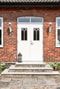 Till boningshuset finns två entréer, jag väljer den centralt placerade med en vacker pardörr. Entréhall med ekgolv samt plats för klädavhängning. Badrum med badkar, wc och tvättställ.