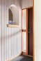 Liten hall en halvtrappa upp som leder till kök med matplats, allrum och gästtoalett.