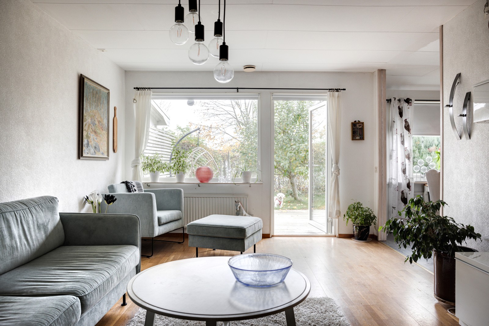 Vardagsrum med parkettgolv och utgång till trädgård och altandäck.