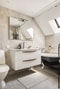 Trappan kommer upp i ett nätt allrum med takfönster, här ges perfekt plats för barnens tv- och spelaktiviteter.