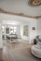 Pardörr visar vägen till ett ljust och trivsamt sällskapsrum med vacker takmålning. Matrum i öppen planlösning med sällskapsrummet gör att ljuset flödar fint. Köket ligger praktiskt bredvid.