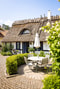 Lättskött tomt med stenlagd innergård. Staket som skärmar av tillsammans med grönskande häckar. Underbart med rosor, lavendel, prydnadsträd och formklippta häckar - precis som det ska vara! Här finns till och med bärbuskar och ett litet växthus.