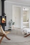 Innanför ytterdörren på husets långsida väntar en entré och hall med laminatgolv. Allrummet öppnar upp sig och ger en välkomnande och social känsla åt hela huset. Laminatgolv, en värmande eldstad, strategiskt placerad.