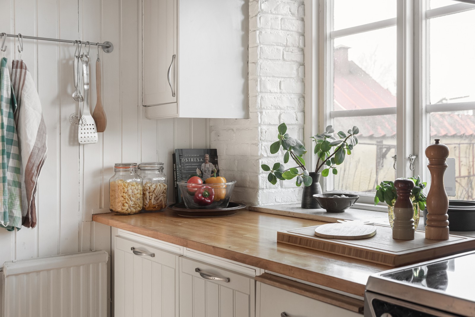 Vardagsrummet bjuder in till mysiga stunder framför den värmande kaminen, och i det fina och hemtrevliga köket finns gott om plats för både matlagning och trevliga middagar.