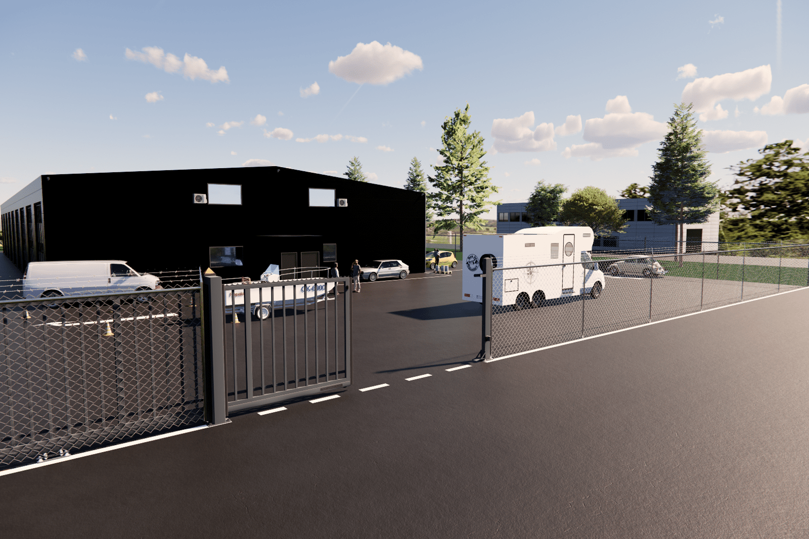 För att öka säkerheten inhägnas hela området med stängsel och utrustas med en automatisk port. Asfaltering utförs på såväl gemensamma som privata ytor. Vid varje port finns möjlighet till parkering av två personbilar.