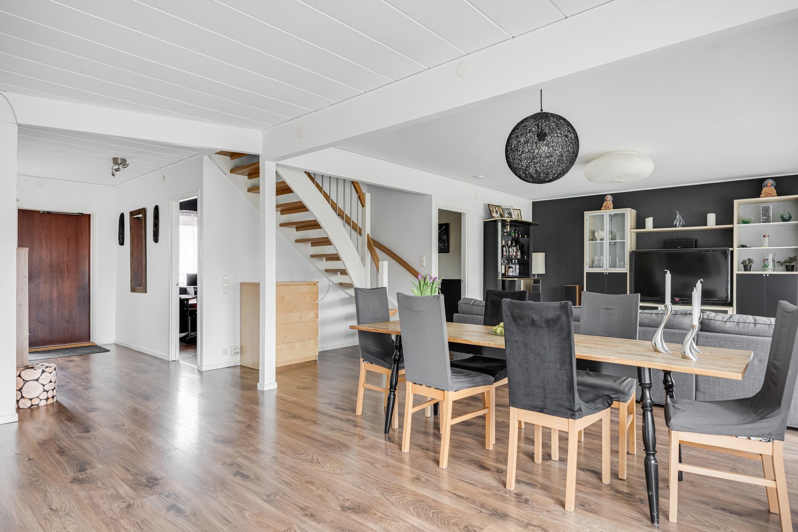 Vardagsrummet har generösa ytor och rymmer enkelt både soffgrupp och matsalsmöbel, vilket gör det lika perfekt för vardag som för sociala tillfällen. Härifrån nås trädgården och den stensatta uteplatsen i västerläge, en naturlig förlängning av bostaden under årets varmare månader.