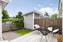 Mysig trädgård med trädäck, förråd och en liten gräsmatta.