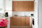 Via trappuppgången upp till våning två nås denna ljusa lägenhet med genomgående planlösning. I den avlånga hallen erbjuds goda förvaringsutrymmen i både garderob och öppen förvaring såsom hatthylla. Hallen följes till det ljusa köket vars form skapar en naturlig yta för matmöblemang. Köket pryds av köksluckor i trä med vitt kakel och arbetsytor i laminat. Den stora diskbänken är i rostfritt stål och köket innehåller både kyl och både kyl, frys, spis och diskmaskin är i vit färg, vilket skapar ett enhetligt intryck.