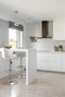 I öppen planlösning med allrummet finns det moderna köket med köksinredning i vitt, spotlights i tak.