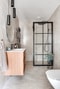 Elegant, modernt och stilrent badrum som är renoverat 2022. Helkaklat med klinker och kakel i Marmorea2 Oxford Greige (60x60cm plattor). Utrustat med toalett, dusch, handfat med kommod, spegel, golvvärme och handukstork. Infällda spotlights i tak.