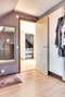Vi kliver in i bostadens entré som har parkettgolv som även löper vidare in i hall och vardagsrum. På väggen finns fin tapet. Avhängningsplats för ytterkläder direkt till höger.