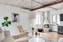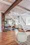 Hall med trägolv och fint ljusinsläpp. Synliga träbjälkar i taket ger extra charm och karaktär.