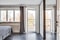 Rymligt sovrum med plats för dubbelsäng. Grått laminatgolv och vita målade väggar. Praktisk klädkammare ger gott om förvaring. Från fönstret skymtar havet.
