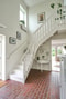 Klinkers på golvet, vitmålad tapet, öppet upp i nock. Trappa till övre plan.