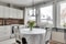 Till höger om entrén ligger köket, ett stilrent vitt IKEA-kök med stänkskydd i tegel ovan den svart/grå bänkskivan. Den maskinella utrustningen består av ugn, kyl och frys från Siemens, fläkt samt diskmaskin. Här finns en matplats för fyra personer med utsikt mot gatan. Klinkergolv och vita tapeter även här.