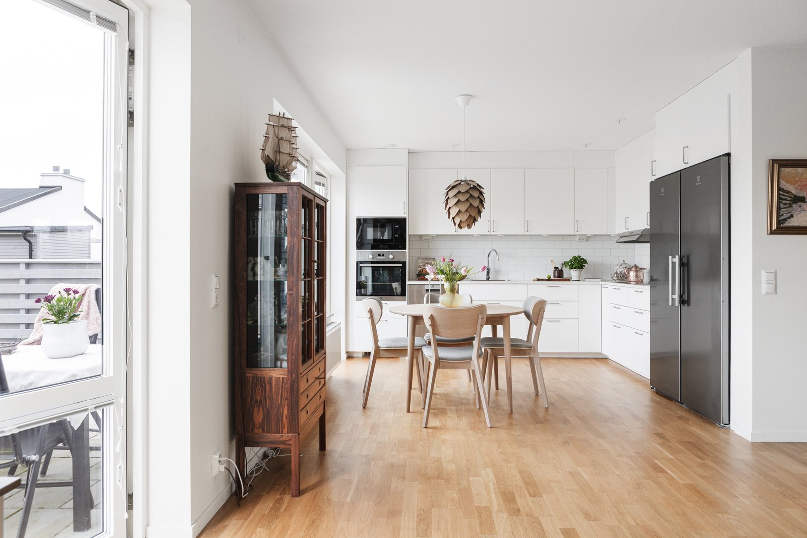 Köket från IKEA har en stilren design och är både funktionellt och inbjudande. De släta, vita luckorna harmonierar fint med det vita kaklet ovan arbetsytorna. Den maskinella utrustningen från Electrolux – inklusive kyl, frys, spishäll, fläkt, inbyggd ugn, micro och diskmaskin – gör köket välutrustat för både vardag och fest. Ekparkett och ljusa väggar bidrar till en varm och trivsam atmosfär. Från köket finns dessutom direkt utgång till bostadens uteplats.