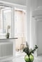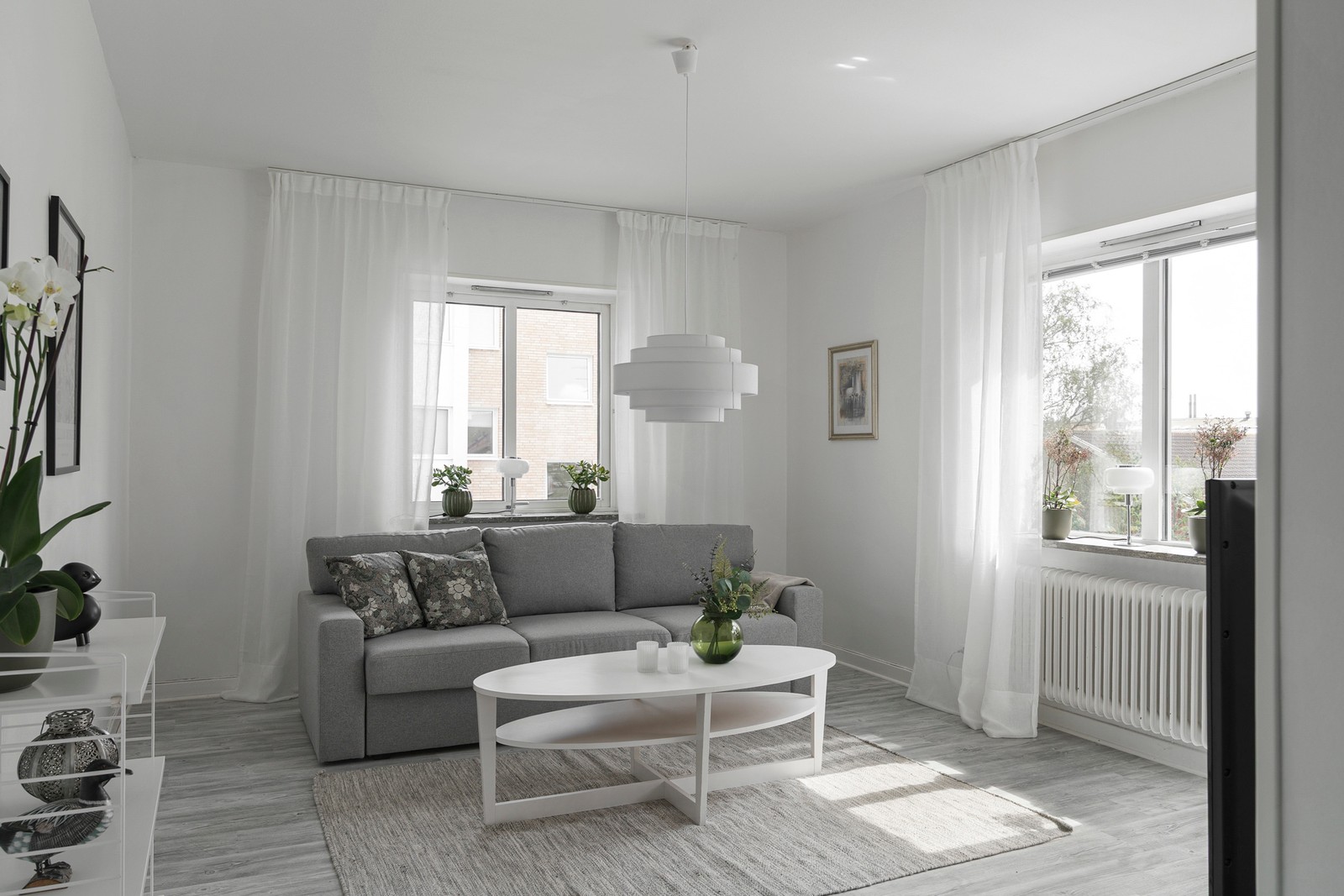 Ljusgrått laminat på golv (parkett under) och vitmålade väggar. Härifrån finns utgång till balkong i söderläge.