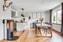 Matplats och vardagsrum ligger i öppen planlösning med samma vackra ekparkett. Här finns gott om plats för både stora middagar och avkoppling, och mitt i rummet står en välplacerad täljstenskamin som skänker både värme och atmosfär.