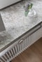 Laminatgolv och ljusa väggar. Vit köksinredning med bänkskiva i laminat. Köket är