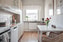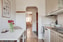 Till höger finner du det ljusa vardagsrummet med gott om plats för både soffa och matgrupp. Till vänster ligger köket, inrett med beigea köksluckor, matchande kakel och en lackad träbänkskiva. Här finns varmluftsugn med spishäll, fläkt, samt nyare kyl/frys och diskmaskin (2023). Matplats för två personer.