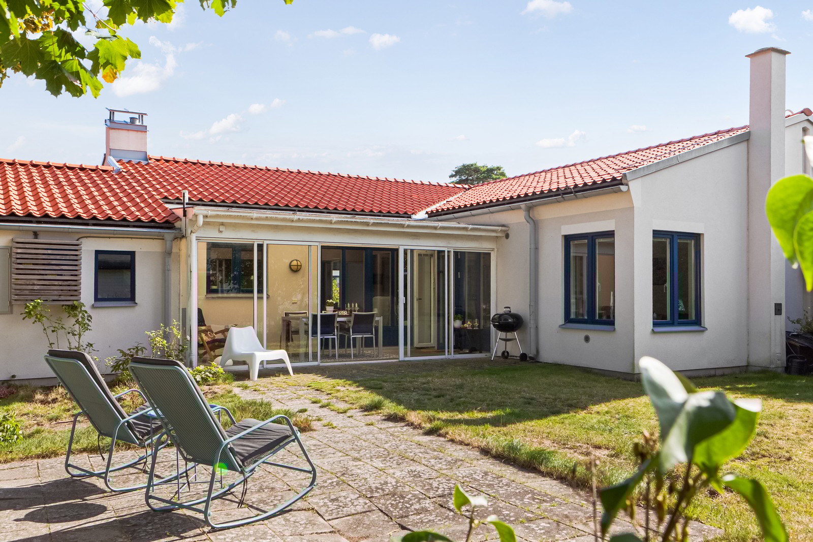 Tomten är lättskött och inramad, med en skyddad trädgård som erbjuder både lek- och avkopplingsytor. På den soliga uteplatsen kan du njuta av ljumma sommarkvällar, grilla med vänner eller bara läsa en bok i lugn och ro. Det inglasade uterummet fungerar som ett extra vardagsrum stora delar av året – ett riktigt plus i det skånska klimatet.