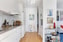 Vitpigmenterad mattlackad ek, på golv och målade väggar. Kök från Marbodal, arbetsbänk i kvartskomposit. Stänkskydd av vit kakel. Vitvaror från Electrolux.