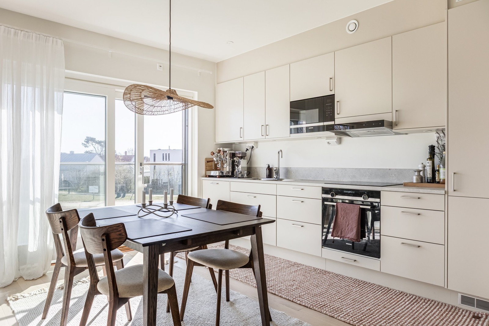 Det här är en bostad där design och funktion samspelar i perfekt harmoni. Materialval och utförande håller hög standard, och den öppna planlösningen mellan kök och vardagsrum skapar en generös och social yta. Två franska balkonger släpper in rikligt med ljus och bjuder på en grön och rogivande utsikt – lika vackert året runt.