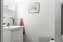 Gästtoalett med wc, handfat med kommod, plastmatta på golvet och målade väggar.