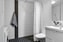 Helkaklat badrum/tvättrum med wc, handfat med kommod, dusch, elpanna och en kombinerad tvättmaskin/torktumlare.