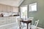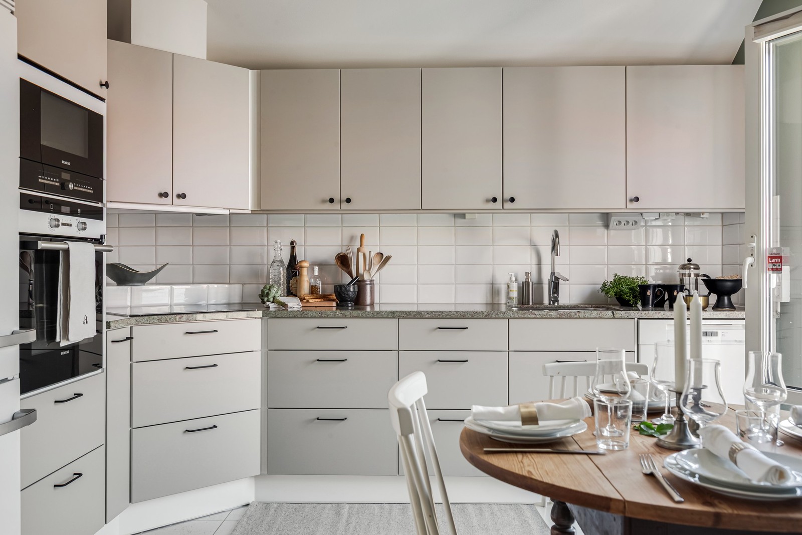 Rakt fram möter vi det fina köket. Här ligger samma stilrena klinker som i hallen och väggarna är målade i vitt med en sobert grön fondvägg. Köksinredningen från Härjedalskök (2025) går i en elegant ljusgrå ton, kompletterad av en exklusiv granitbänkskiva och vitt kakel. Här finns alla bekvämligheter på plats: kyl/frys (Miele), ugn (Siemens), mikro (Siemens), induktionshäll (Siemens), diskmaskin (Miele) och fläkt (Thermex). Från köket kliver du ut på en av bostadens två balkonger, där du kan njuta av eftermiddagssol och en rogivande utsikt.