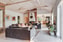 Till höger öppnar spegelpardörrar upp mot det stora sällskapsrummet med tak öppet upp i nock. Terrassdörrar leder ut till den stenlagda uteplatser på framsidan. Rummet har en vacker öppen spis, slipbar ljus parkett och vita väggar. Bakom en halvöppen tegelvägg finns en matplats med ytterligare en terrassdörr till uteplatsen på baksidan.