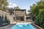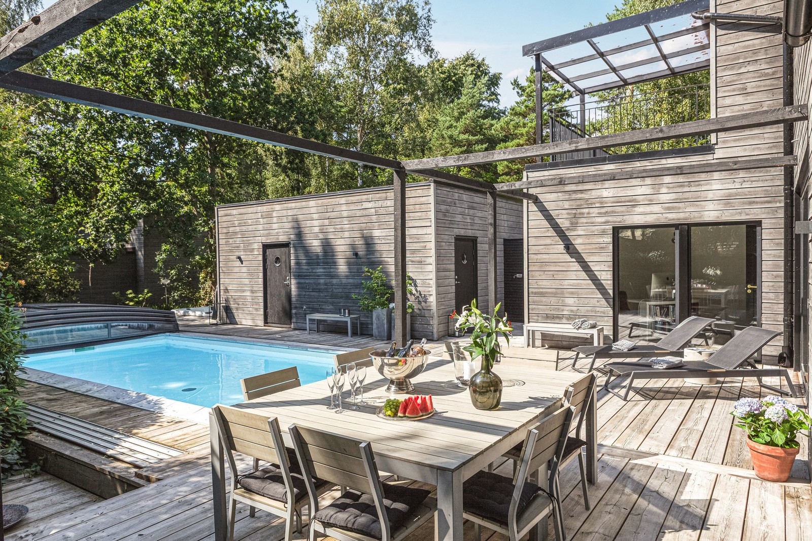 De skjutbara glaspartierna kan stå öppna ut mot sommarkvällens blomdoft och koltrastkvitter. Trädäckets breda träplankor är ännu varma i det kvällssoliga sydvästläget. Den stora platsen ligger skyddad av grönska och byggnadernas vackra brädfasader i vinkel. En nästan rekordartad rhododendronbuske reser sig som en hög vägg. Utanför sällskapsytorna står en stiliserad pergola som skapar rumslighet innan trädäcket övergår i poolområdet. När poolbelysningen tänds i skymningen känns atmosfären igen från en klassisk resort. Trappor leder ner till en avgränsad grillplats samt en kryddträdgård med plank och dörr mot entrésidan. Poolen har överdrag i plexi och runt hörnet finns ett utespa som gärna avnjuts under bar stjärnhimmel.