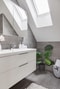 På övre plan finns även ett badrum renoverat 2021, med grå kakel och klinker, golvvärme, infälld takbelysning och handdukstork. Här finns toalett, kommod samt ett badkar placerat under ett takfönster – en härlig plats för ett avkopplande bad under stjärnhimlen.