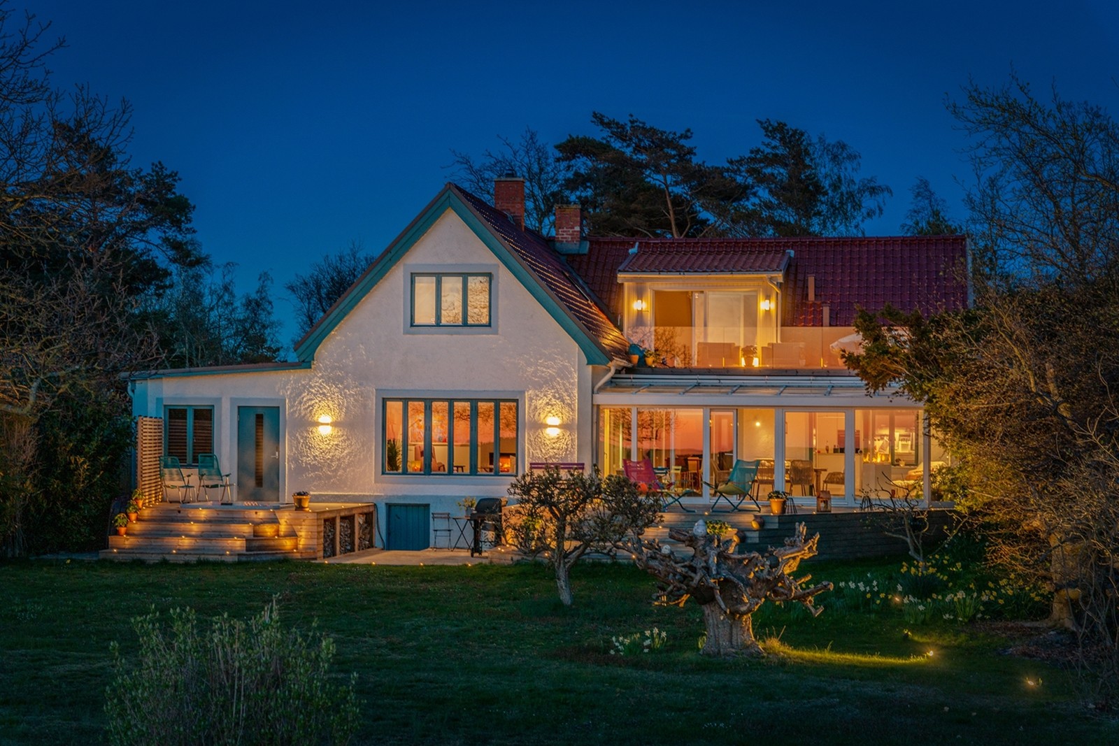 På baksidan pryds fasaden av stora glaspartier mot havet och gamla banvallen. Trädgården är av lummig och lätt kuperad karaktär med både gräsytor och altandäck. Huset stod klart 1929 som sommarbostad och är det andra som uppfördes söder om banvallen. Först på åttiotalet började det nyttjas som permanentbostad. När de nuvarande ägarna övertog huset 2019 inleddes en renoveringsresa av stora mått som gör att huset erbjuder de kvalitéer man förväntar sig av ett nybygge. Huset inreddes uteslutande med exklusiva material, skräddarsydda lösningar och genomtänkta detaljer från golv till tak. De sociala ytorna utökades med en helisolerad vinterträdgård med anslutande trädäck och utespa. Takterrassen i sydväst fick ett glasräcke för att maximera vyerna, som sträcker sig hela vägen till Köpenhamn vid klart väder.